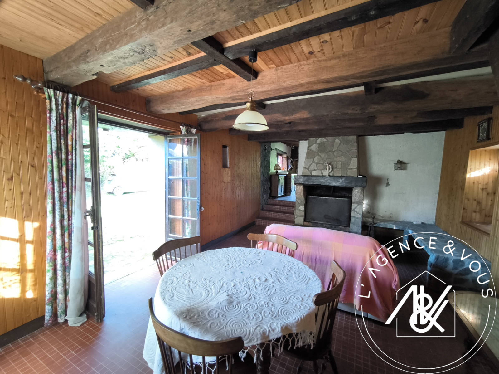 avec une grande cheminée en pierre, porte vitrée accès jardin