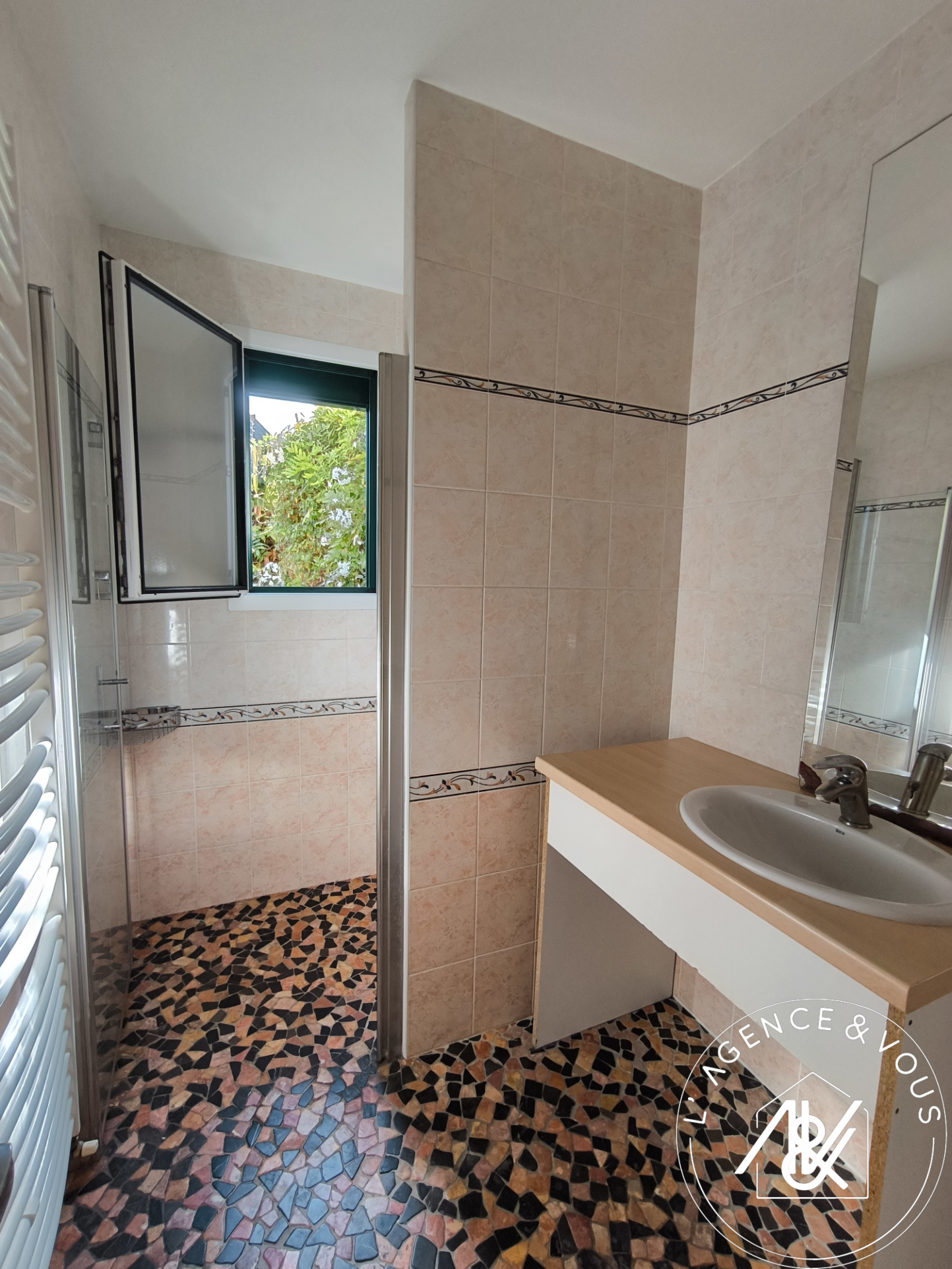 Grande douvhe et vasque. Sèche serviettes et fenêtre.