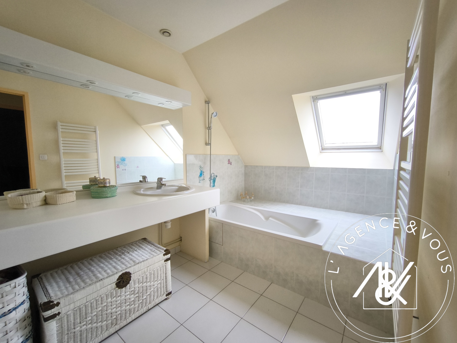 Une vasque, une baignoire et un sèche serviettes, vélux.