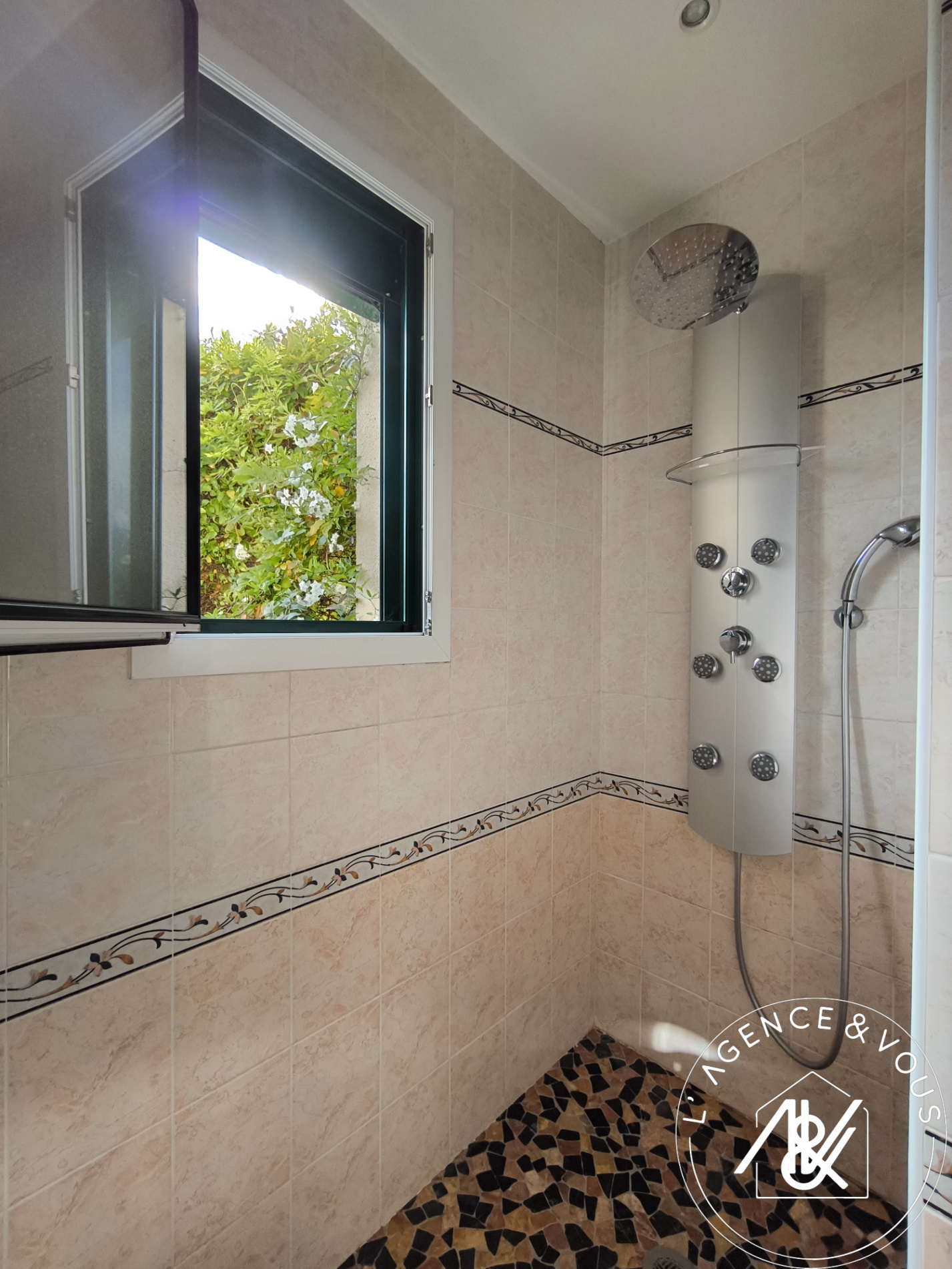 Grande douvhe et vasque. Sèche serviettes et fenêtre.