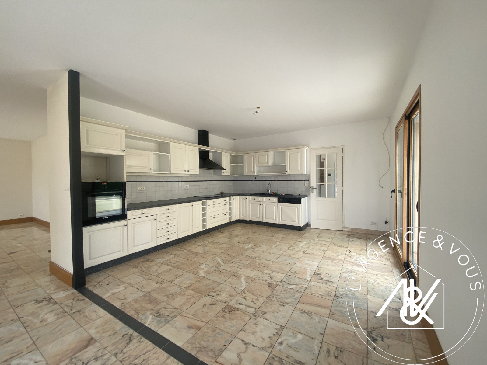 Cuisine ouverte sur salon/séjour, aménagée et équipée. Baie sécurisée donnant sur la terrasse et piscine.