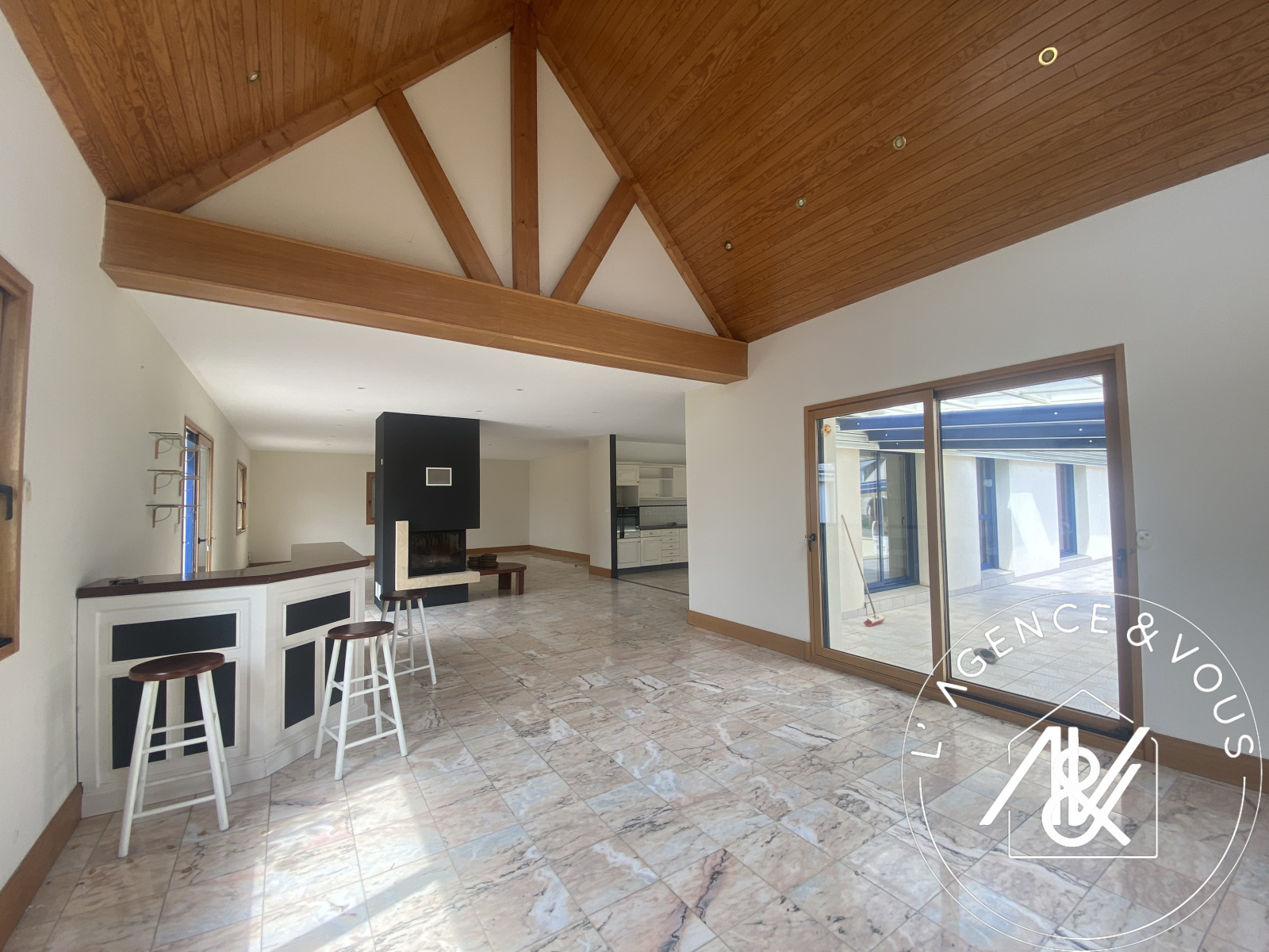 Beau volume, belle hauteur sous plafond, cheminée insert centrale. Baie sécurisée donnant sur la piscine et terrasse.